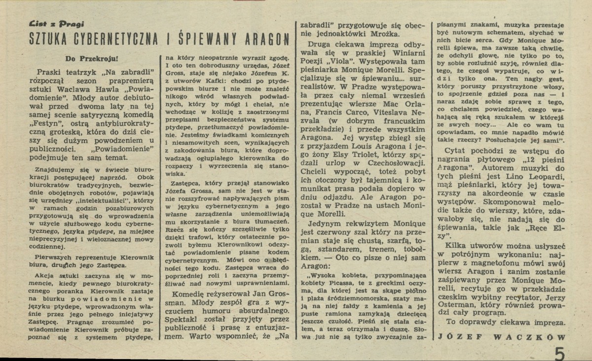 Archiwum / korespondencja własna "Przekroju" nr 1071 (42/1965) 40/222 Podziel się Tytuł Sztuka cybernetyczna i śpiewany aragon Autor Józef Waczków Rubryka korespondencja własna "Przekroju" Artykuł z numeru 1071 (42/1965) Data wydania 17 października 1965 Tagi praga teatrzyk