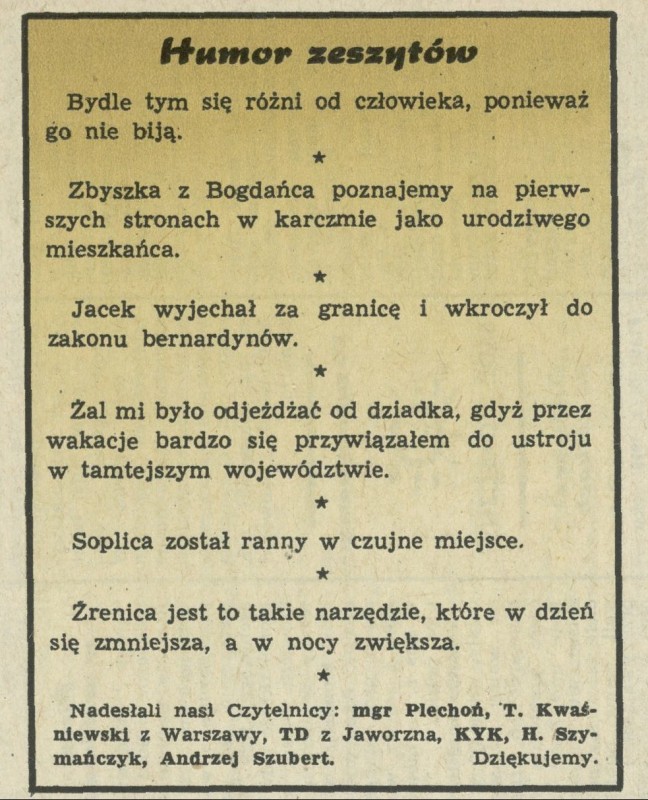 Archiwum / Humor zeszytów szkolnych nr 1071 (42/1965) 40/49 Podziel się Tytuł Humor zeszytów Rubryka Humor zeszytów szkolnych Artykuł z numeru 1071 (42/1965) Data wydania 17 października 1965