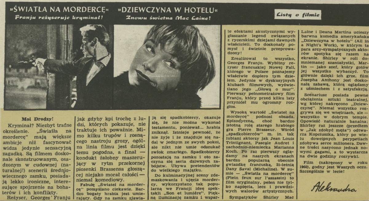 Archiwum / Listy o filmie nr 951 (26/1963) 306/1624 Podziel się Tytuł Listy o filmie Autor Aleksandra Rubryka Listy o filmie Artykuł z numeru 951 (26/1963) Data wydania 30 czerwca 1963 Tagi Shirley MacLaine kryminał Dziewczyna w hotelu