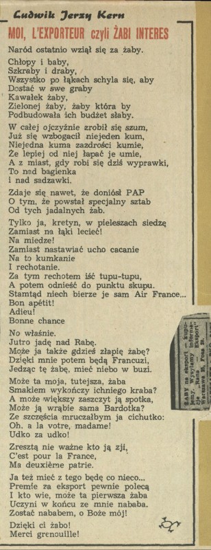 Archiwum / Rozmaitości [old] nr 1054 (25/1965) 27/51 Podziel się Tytuł Moi, L'exporteur czyli żabi interes Autor Ludwik Jerzy Kern Rubryka Rozmaitości [old] Artykuł z numeru 1054 (25/1965) Data wydania 20 czerwca 1965 Tagi naród żaby chłopy baby ojczyzna