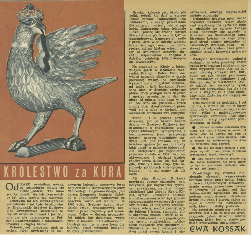 Archiwum / Reportaż nr 1082 (01/1966) 45316/123969 Podziel się Tytuł Królestwo za kura Autor Ewa Kossak Kategoria Reportaż Artykuł z numeru 1082 (1/1966) Data wydania 1 stycznia 1966
