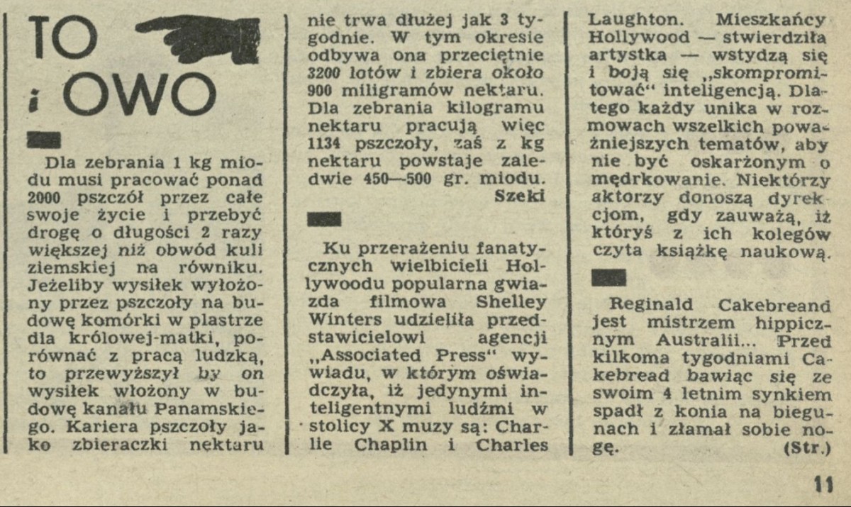 Archiwum / To i owo nr 259 (13/1950) 01/44 Podziel się Tytuł To i owo Autor Str. Rubryka To i owo Artykuł z numeru 259 (13/1950) Data wydania 26 marca 1950 Tagi miód Shelley Winters Hollywood Cakebreand
