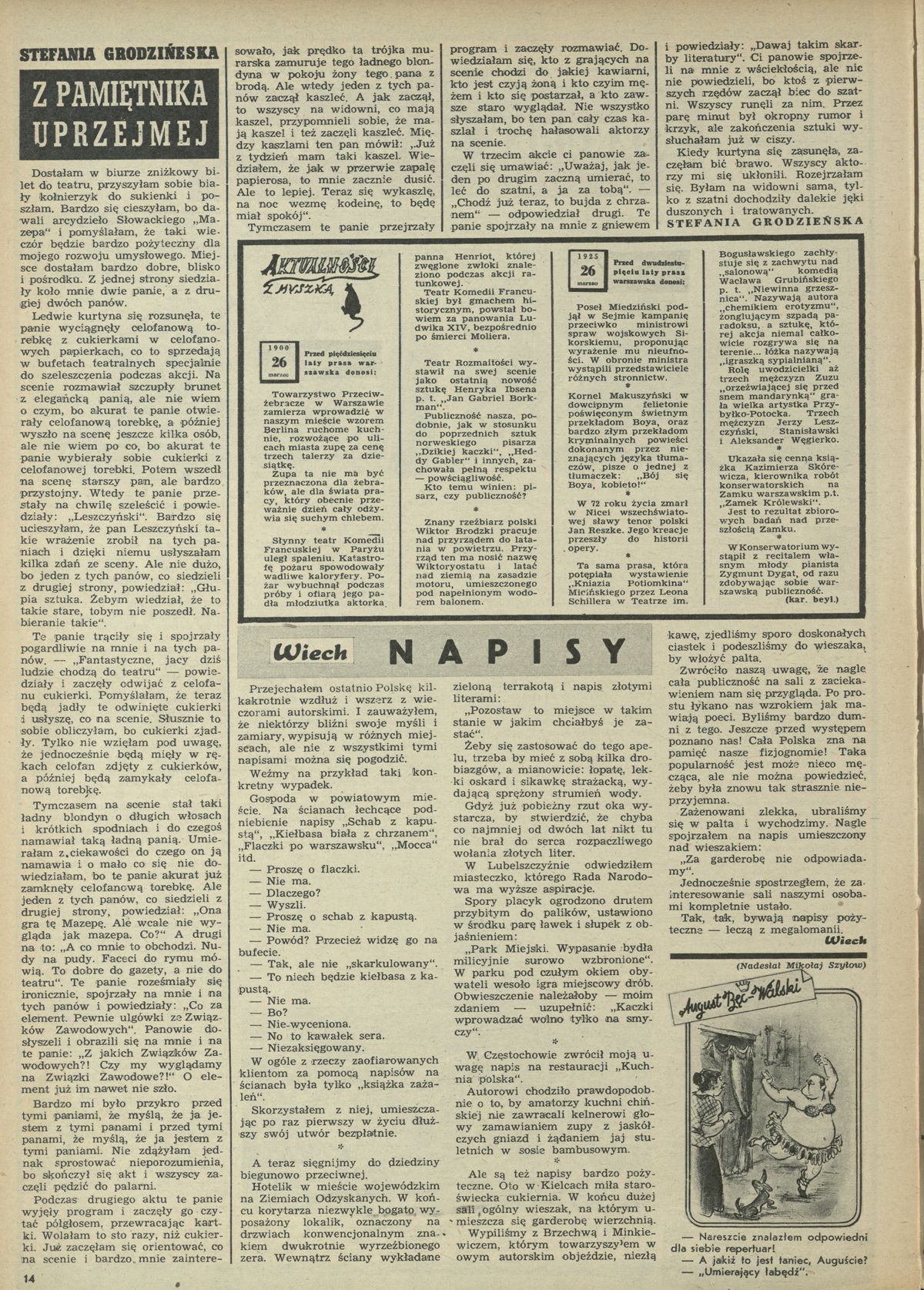 Archiwum / Felieton nr 259 (13/1950) 11/380 Podziel się Tytuł Z pamiętnika uprzejmej Autor Stefania Grodzieńska Kategoria Felieton Artykuł z numeru 259 (13/1950) Data wydania 26 marca 1950 Tagi teatr