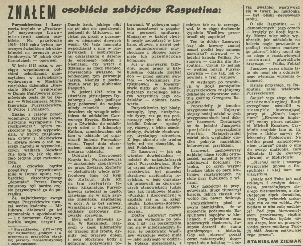 Archiwum / Artykuł nr 1064 (35/1965) 120/190 Podziel się Tytuł Znałem osobiście zabójców Rasputina Autor Stanisław Ziemak Kategoria Artykuł Artykuł z numeru 1064 (35/1965) Data wydania 29 sierpnia 1965 Tagi Puryszkiewicz Łazowert