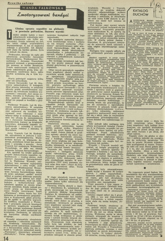 Archiwum / Kronika sądowa nr 1091 (10/1966) 78272/123969 Podziel się Tytuł Zmotoryzowani bandyci Autor Wanda Falkowska Rubryka Kronika sądowa Artykuł z numeru 1091 (10/1966) Data wydania 6 marca 1966