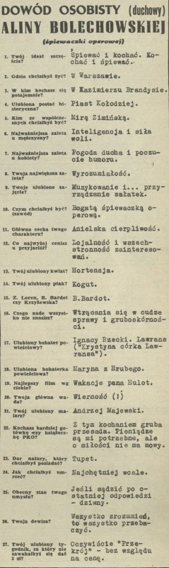 Archiwum / Dowód osobisty (duchowy) nr 897 (24/1962) 48/220 Podziel się Tytuł Dowód osobisty (duchowy) Aliny Bolechowskiej (śpiewaczki operowej) Rubryka Dowód osobisty (duchowy) Artykuł z numeru 897 (24/1962) Data wydania 17 czerwca 1962 Tagi zabawa pytania kwestionariusz ankieta