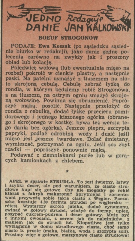 Archiwum / Jedno danie nr 1079 (50/1965) 46/47 Podziel się Tytuł Boeuf strogonow Autor Jan Kamyczek Rubryka Jedno danie Artykuł z numeru 1079 (50/1965) Data wydania 12 grudnia 1965 Tagi gastronomia kulinaria przepis kulinarny mięso deser strudel