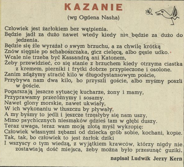 Archiwum / Rozmaitości nr 994 (17/1964) 41766/123969 Podziel się Tytuł Kazanie Autor Ogden Nash Ludwik Jerzy Kern Rubryka Rozmaitości Artykuł z numeru 994 (17/1964) Data wydania 26 kwietnia 1964 Tagi wiersz