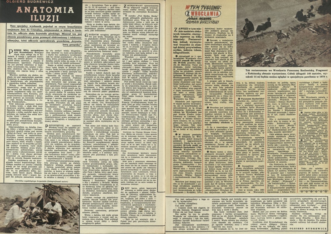 Archiwum / korespondencja własna "Przekroju" nr 1075 (46/1965) 209/438 Podziel się Tytuł Anatomia iluzji Autor Olgierd Budrewicz Rubryka korespondencja własna "Przekroju" Artykuł z numeru 1075 (46/1965) Data wydania 14 listopada 1965 Tagi kryształ górski złoża
