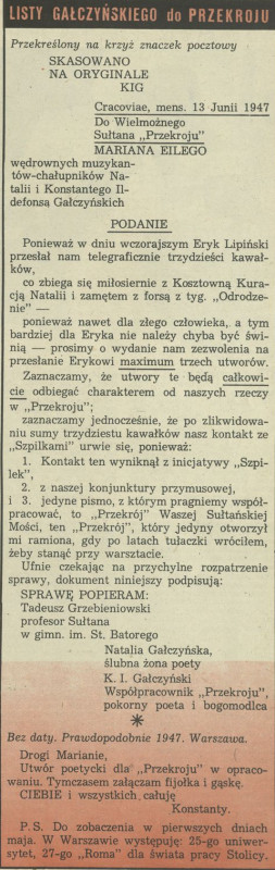 Archiwum / korespondencja własna "Przekroju" nr 1004 (27/1964) 5/6 Podziel się Tytuł Listy Gałczyńskiego do „Przekroju” Autor Konstanty Ildefons Gałczyński Rubryka korespondencja własna "Przekroju" Artykuł z numeru 1004 (27/1964) Data wydania 5 lipca 1964 Tagi eryk lipiński marian eile przekrój