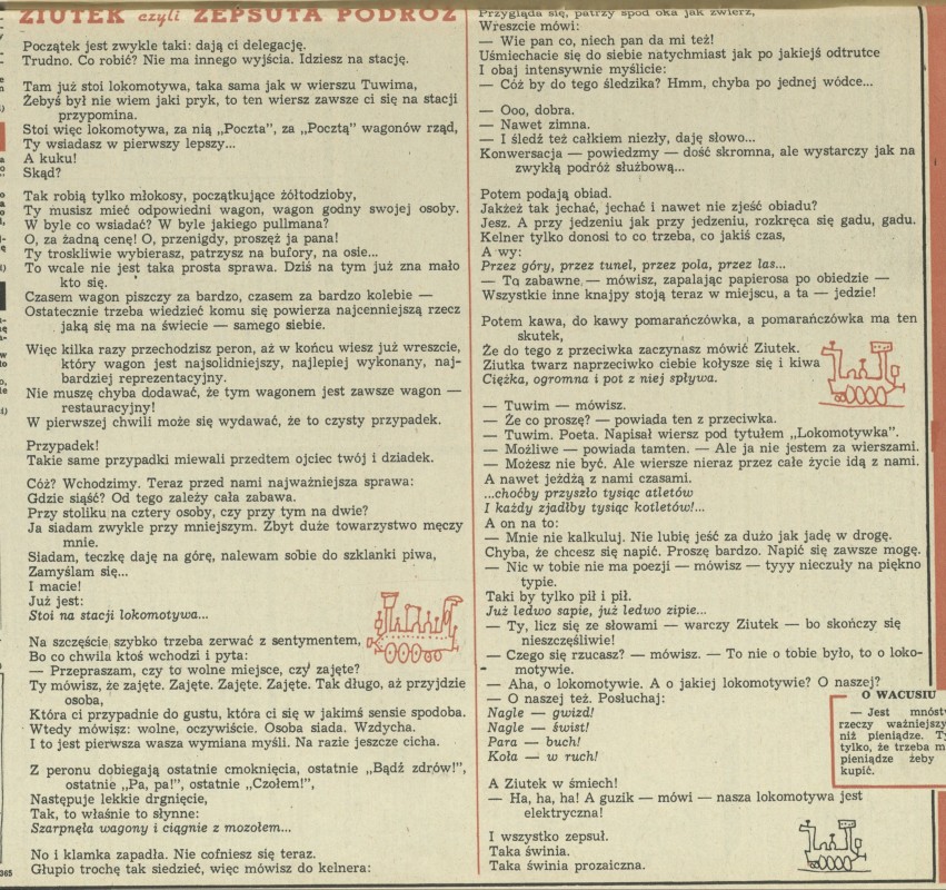 Archiwum / Rozmaitości [old] nr 1150 (17/1967) 20/64 Podziel się Tytuł Ziutek czyli zepsuta podróż Autor Ludwik Jerzy Kern Rubryka Rozmaitości [old] Artykuł z numeru 1150 (17/1967) Data wydania 23 kwietnia 1967 Tagi Ludwik Jerzy Kern poezja