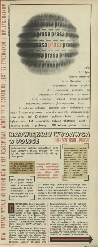 Archiwum / Kultura nr 1151 (18/1967) 17/181 Podziel się Tytuł Największy wydawca w Polsce Kategoria Kultura Artykuł z numeru 1151 (18/1967) Data wydania 1 maja 1967 Tagi RSW Prasa Czytelnik