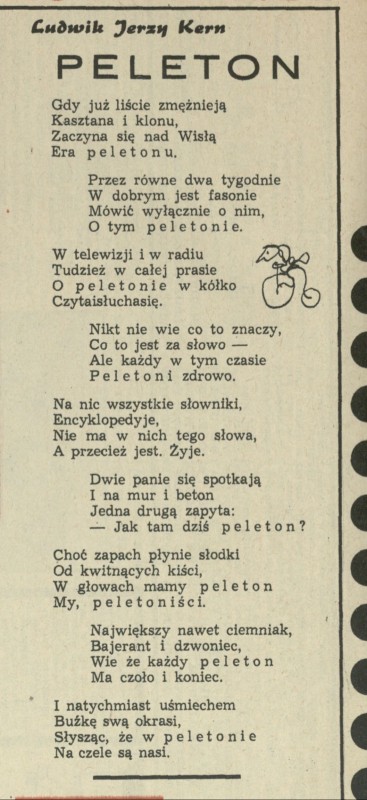 Archiwum / Rozmaitości [old] nr 1151 (18/1967) 48089/123969 Podziel się Tytuł Peleton Autor Ludwik Jerzy Kern Rubryka Rozmaitości [old] Artykuł z numeru 1151 (18/1967) Data wydania 1 maja 1967 Tagi Ludwik Jerzy Kern poezja
