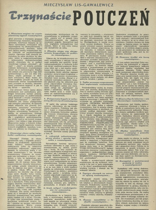 Archiwum / Artykuł nr 260 (14/1950) 8116/123969 Podziel się Tytuł Trzynaście pouczeń Autor Mieczysław Lis-Gawalewicz Kategoria Artykuł Artykuł z numeru 260 (14/1950) Data wydania 2 kwietnia 1950 Tagi reumatyzm zdrowie porady