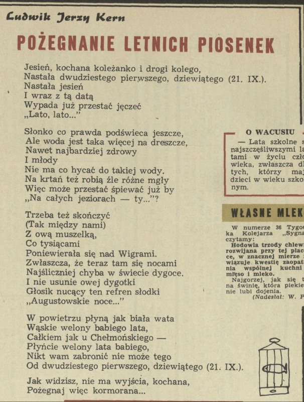 Archiwum / Rozmaitości [old] nr 1121 (40/1966) 46963/123969 Podziel się Tytuł Pożegnanie letnich piosenek Autor Ludwik Jerzy Kern Rubryka Rozmaitości [old] Artykuł z numeru 1121 (40/1966) Data wydania 2 października 1966