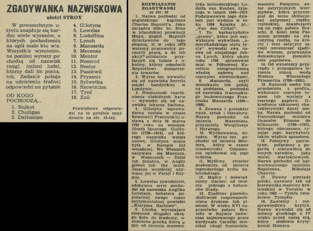 Archiwum / Łamigłówki Przekroju nr 261 (15/1950) 8144/123969 Podziel się Tytuł Zgadywanka nazwiskowa Autor Stroy Rubryka Łamigłówki Przekroju Artykuł z numeru 261 (15/1950) Data wydania 10 kwietnia 1950 Tagi zagadka zgadywanka łamigłówka