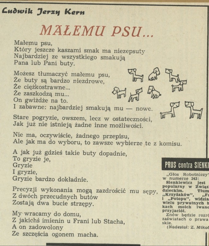 Archiwum / Rozmaitości [old] nr 1127 (46/1966) 42/354 Podziel się Tytuł Małemu psu Autor Ludwik Jerzy Kern Rubryka Rozmaitości [old] Artykuł z numeru 1127 (46/1966) Data wydania 13 listopada 1966