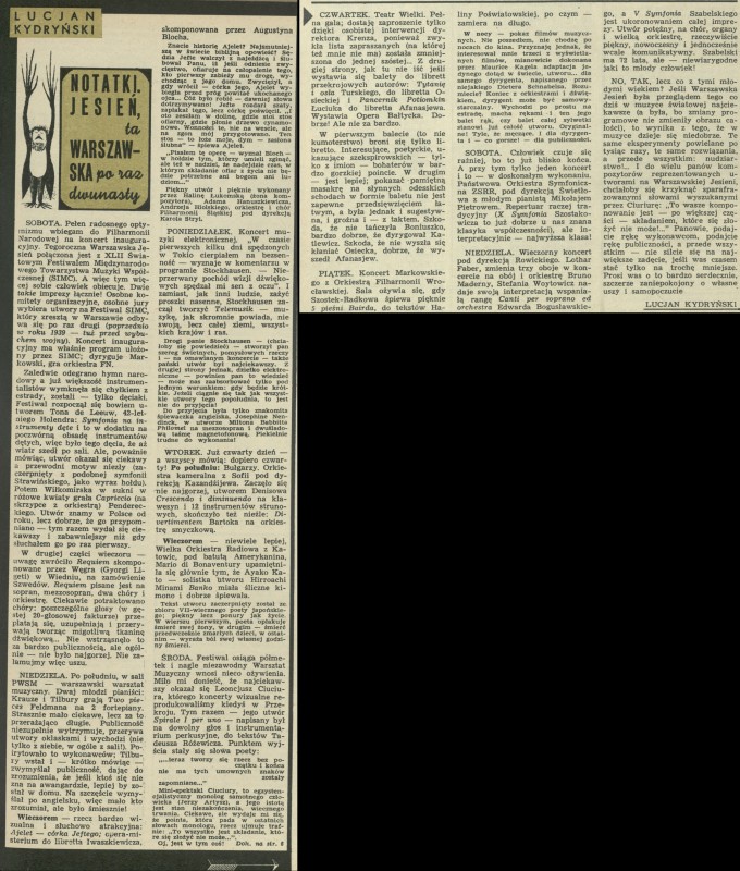Archiwum / Felieton nr 1227 (41/1968) 48990/123969 Podziel się Tytuł Notatki. Jesień, ta warszawska po raz dwunasty Autor Lucjan Kydryński Kategoria Felieton Artykuł z numeru 1227 (41/1968) Data wydania 13 października 1967 Tagi Warszawska Jesień SIMC