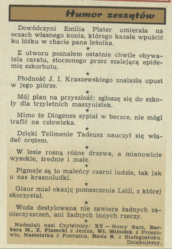 Archiwum / Humor zeszytów szkolnych nr 1127 (46/1966) 1204/1474 Podziel się Tytuł Humor zeszytów Rubryka Humor zeszytów szkolnych Artykuł z numeru 1127 (46/1966) Data wydania 13 listopada 1966