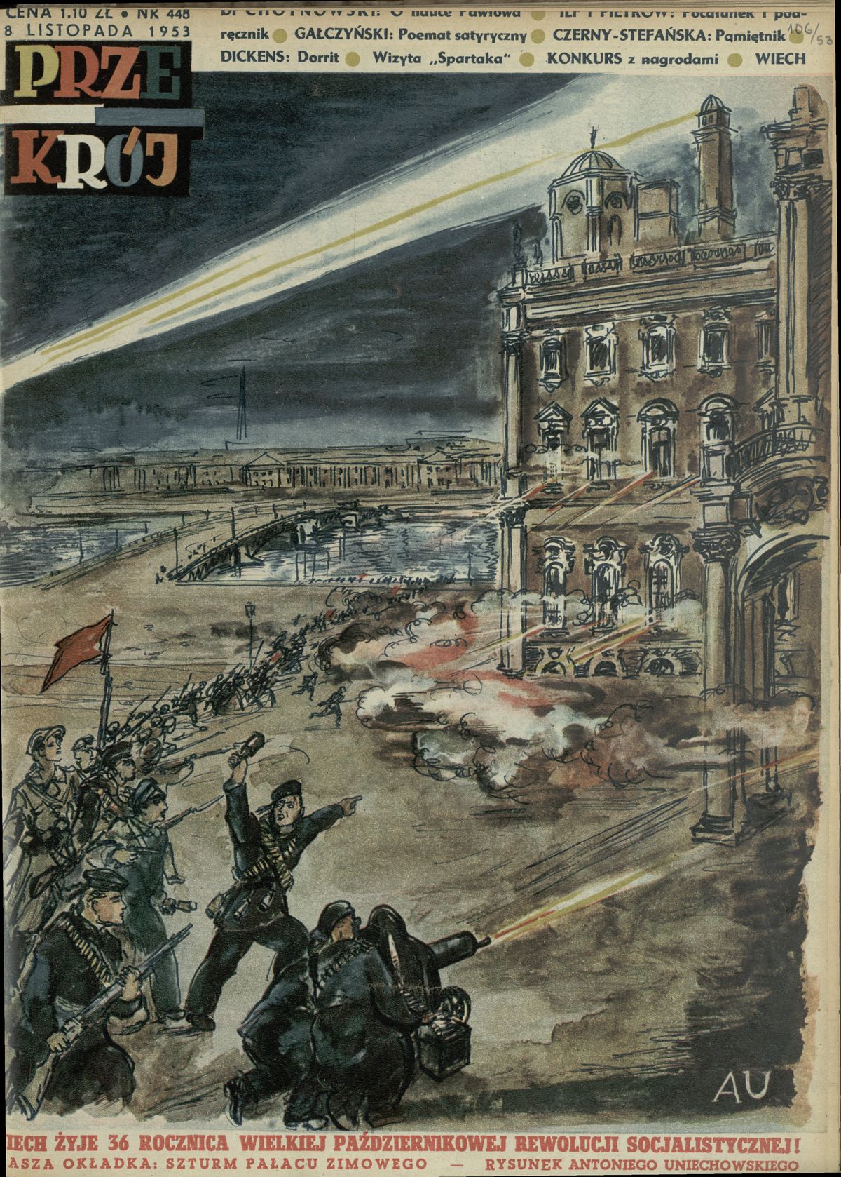Archiwum / Okładki Przekroju nr 448 (45/1953) 42/75 Podziel się Tytuł Okładka Autor Antoni Uniechowski Rubryka Okładki Przekroju Artykuł z numeru 448 (45/1953) Data wydania 8 listopada 1953 Tagi Rewolucja październikowa komunizm socjalizm szturm Pałacu Zimowego