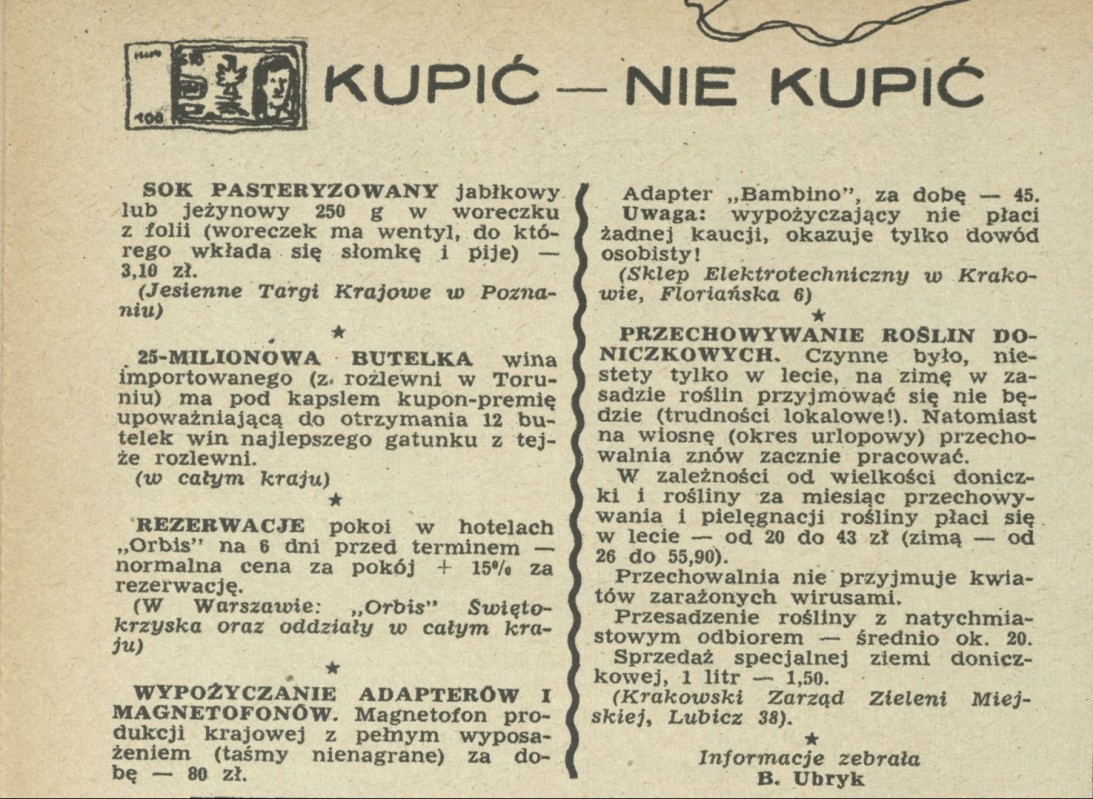 Archiwum / Kupić - nie kupić nr 1014 (37/1964) 42607/123969 Podziel się Tytuł Kupić - nie kupić Autor B. Ubryk Rubryka Kupić - nie kupić Artykuł z numeru 1014 (37/1964) Data wydania 13 września 1964 Tagi zakupy ceny porady