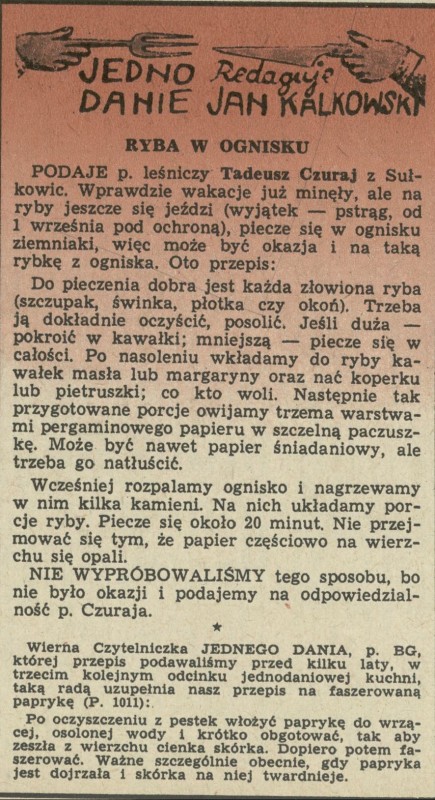Archiwum / Jedno danie nr 1014 (37/1964) 42613/123969 Podziel się Tytuł Ryba w ognisku Autor Jan Kalkowski Rubryka Jedno danie Artykuł z numeru 1014 (37/1964) Data wydania 13 września 1964 Tagi gastronomia kulinaria przepis kulinarny ryba faszerowana paryka