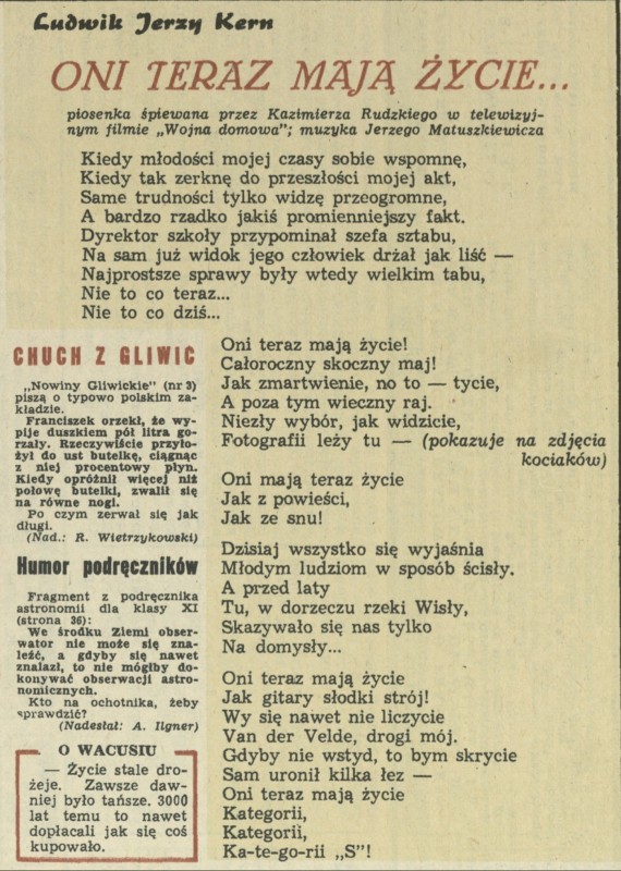 Archiwum / Rozmaitości [old] nr 1138 (05/1967) 47602/123969 Podziel się Tytuł Oni teraz mają życie Autor Ludwik Jerzy Kern Rubryka Rozmaitości [old] Artykuł z numeru 1138 (5/1967) Data wydania 29 stycznia 1967