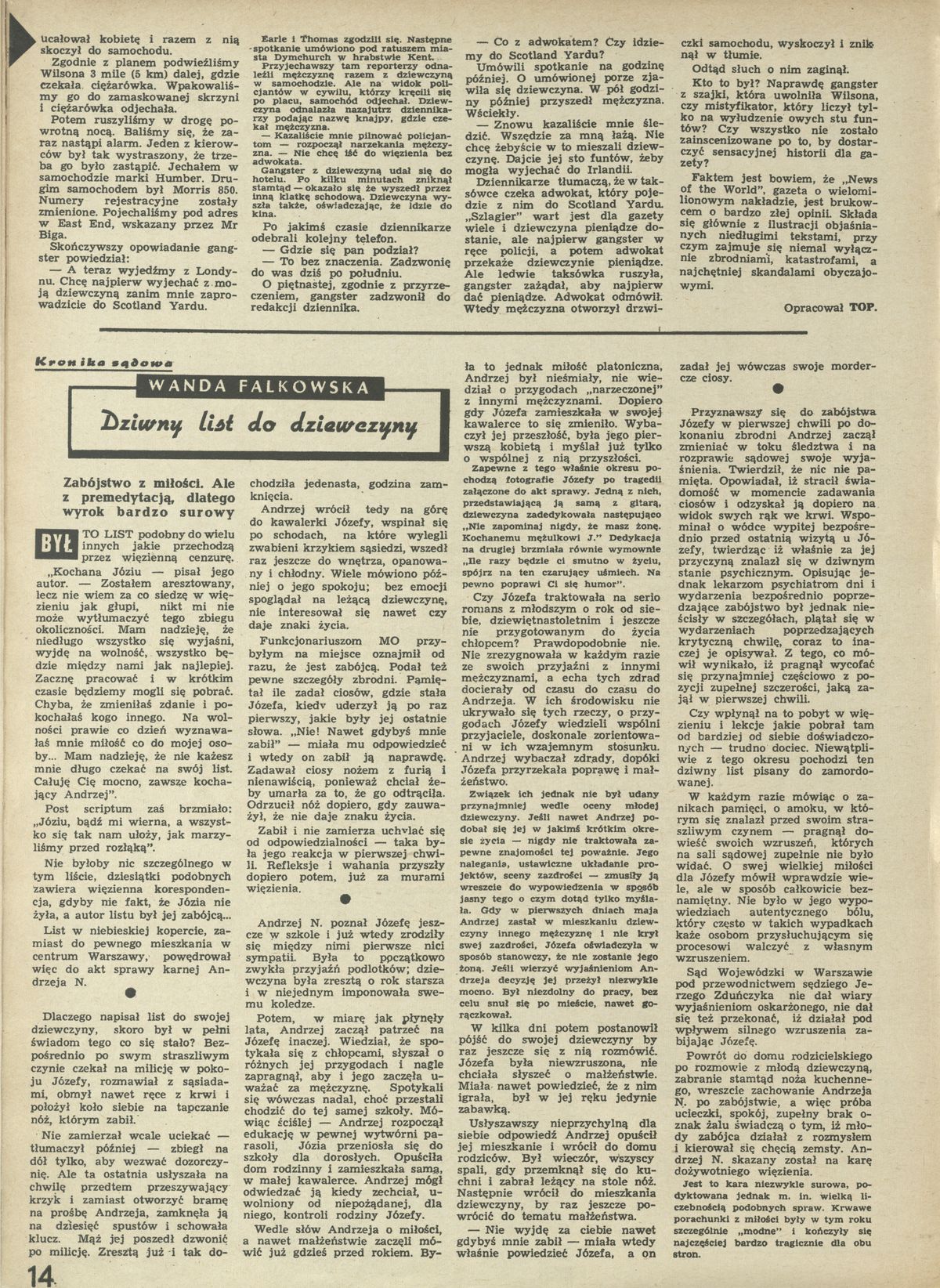 Archiwum / Kronika sądowa nr 1016 (39/1964) 36/48 Podziel się Tytuł Kronika sądowa: dziwny list do dziewczyny Autor Wanda Falkowska Rubryka Kronika sądowa Artykuł z numeru 1016 (39/1964) Data wydania 27 września 1964 Tagi zabójstwo z premedytacją miłość