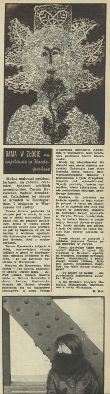 Archiwum / Relacja nr 1144 (11/1967) 74576/121061 Podziel się Tytuł Dama w złocie na wystawie w Kordegardzie Autor Kajetan Kotowicz Kategoria Relacja Artykuł z numeru 1144 (11/1967) Data wydania 12 marca 1967