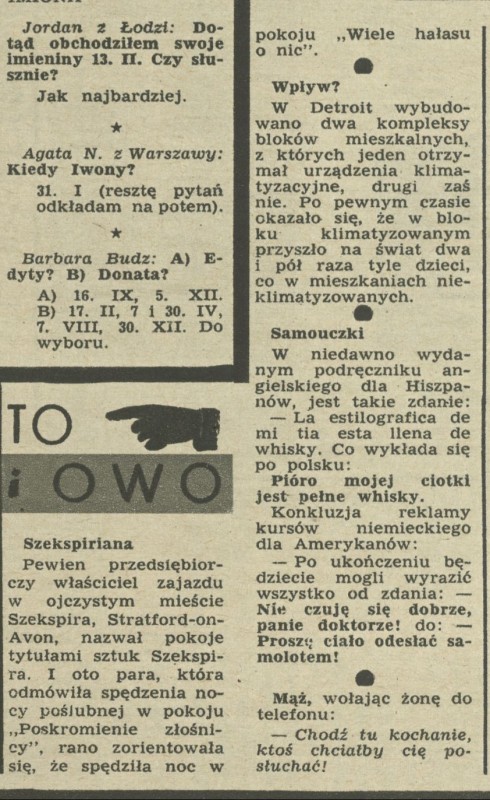 Archiwum / To i owo nr 1017 (40/1964) 42730/123969 Podziel się Tytuł To i owo Rubryka To i owo Artykuł z numeru 1017 (40/1964) Data wydania 4 października 1964 Tagi to i owo różności ciekawostki