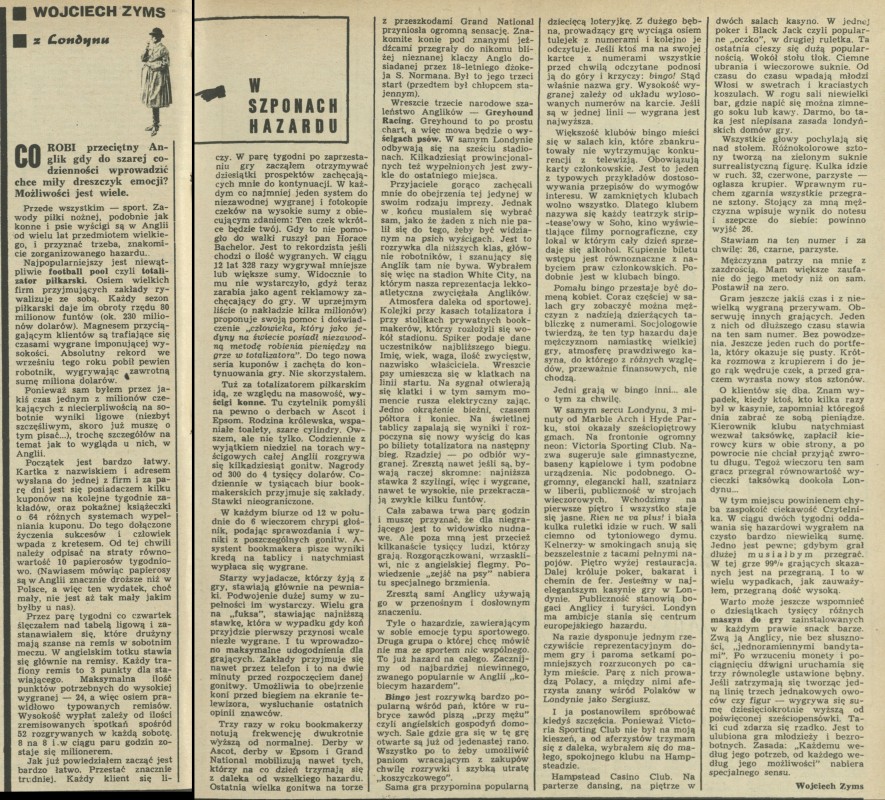 Archiwum / korespondencja własna "Przekroju" nr 1147 (14/1967) 285/438 Podziel się Tytuł W szponach hazardu Autor Wojciech Zyms Rubryka korespondencja własna "Przekroju" Artykuł z numeru 1147 (14/1967) Data wydania 2 kwietnia 1967