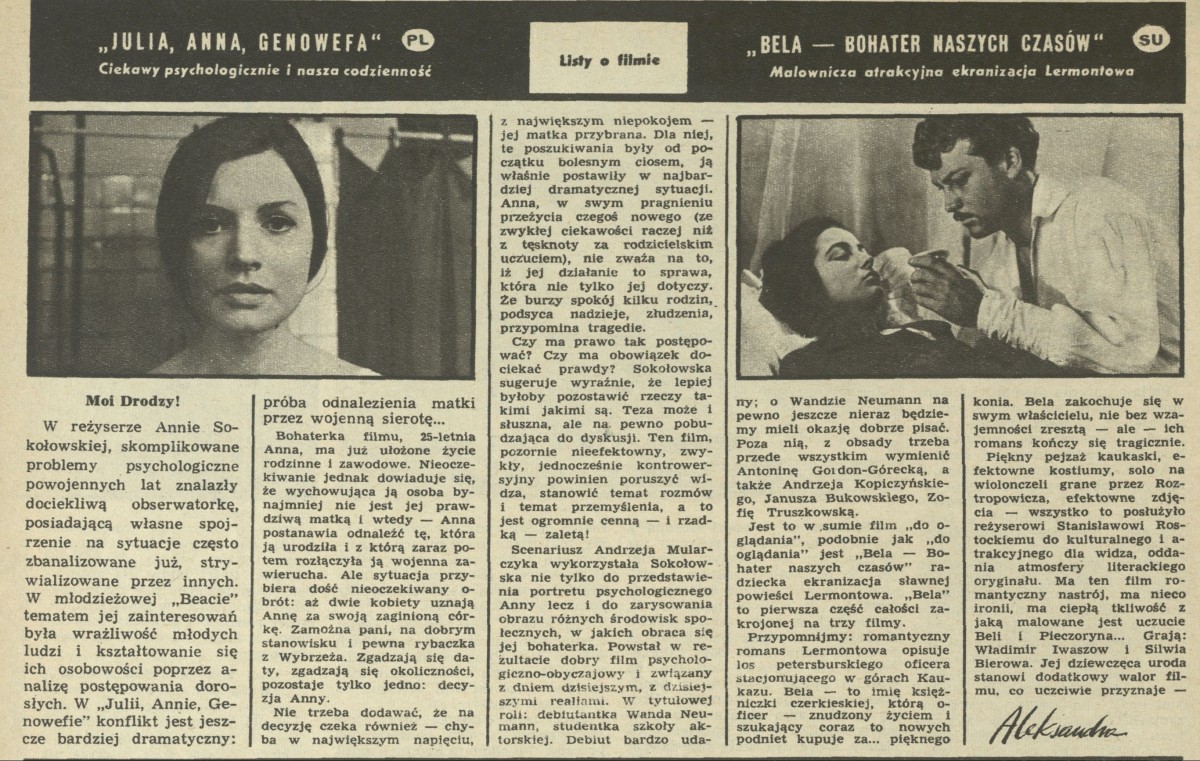 Archiwum / Listy o filmie nr 1199 (13/1968) 88/289 Podziel się Tytuł Listy o filmie Autor Aleksandra Rubryka Listy o filmie Artykuł z numeru 1199 (13/1968) Data wydania 31 marca 1968 Tagi Julia Anna Genowefa Bela - bohater naszych czasów