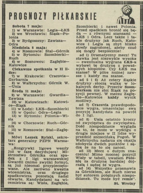 Archiwum / Sport nr 1100 (19/1966) 232/476 Podziel się Tytuł Prognozy piłkarskie Autor Stanisław Wrotny Rubryka Sport Artykuł z numeru 1100 (19/1966) Data wydania 8 maja 1966