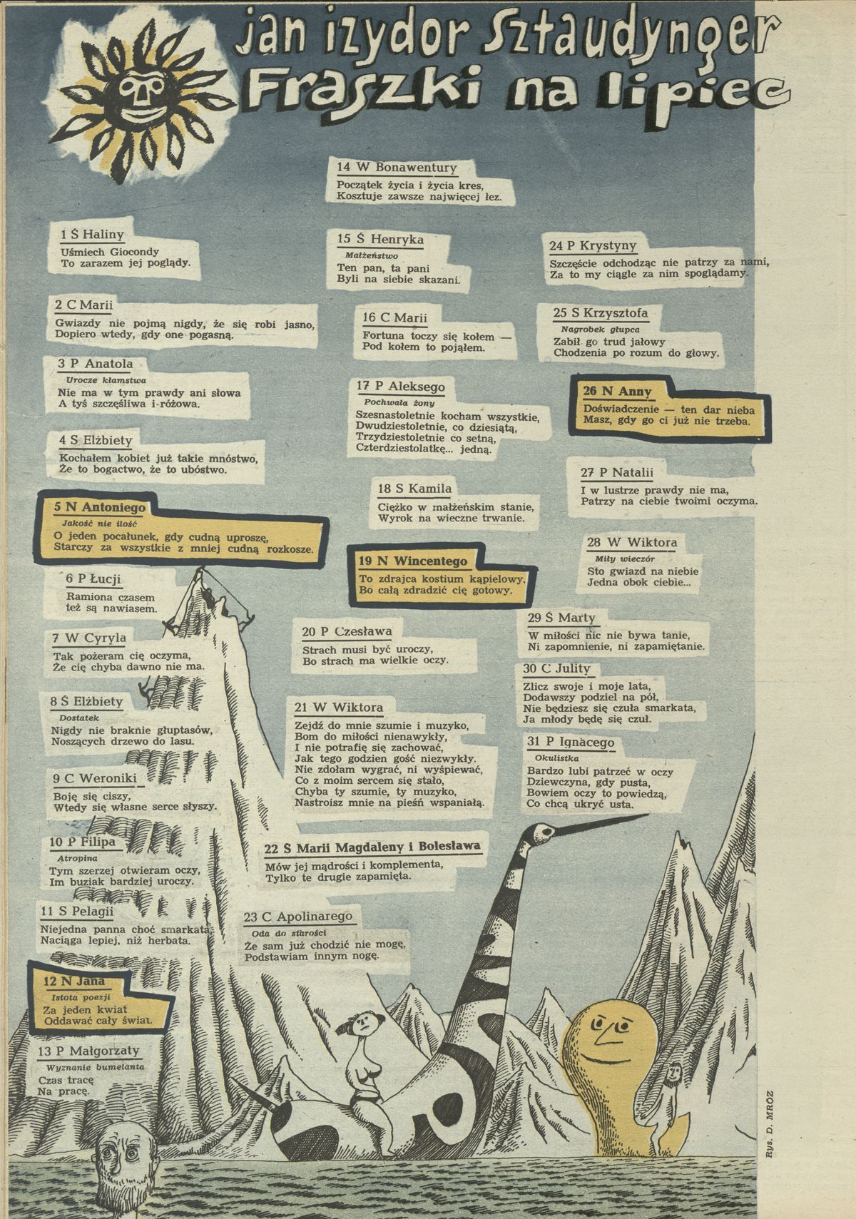 Archiwum / Fraszki nr 743 (27/1959) 113/173 Podziel się Tytuł Fraszki na lipiec Autor Jan Sztaudynger Rubryka Fraszki Artykuł z numeru 743 (27/1959) Data wydania 5 lipca 1959