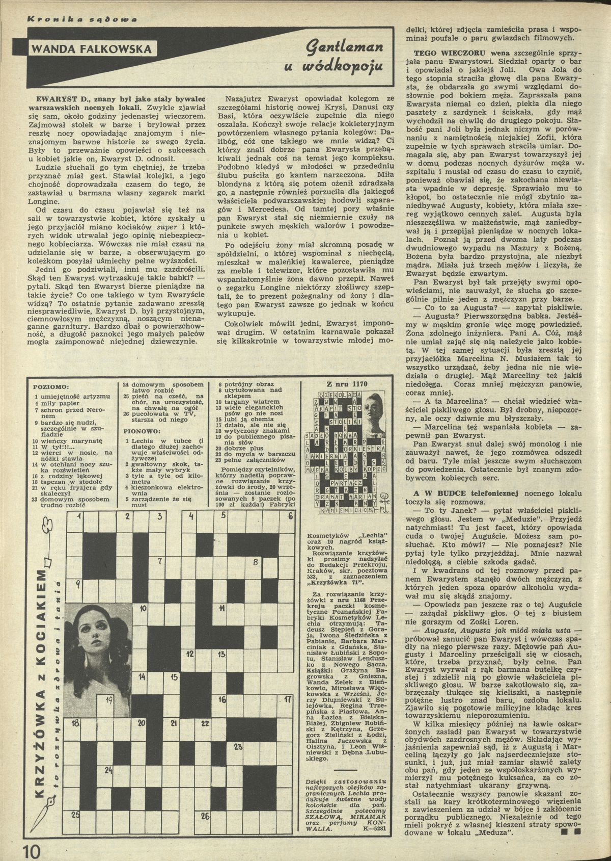 Archiwum / Kronika sądowa nr 1171 (38/1967) 428/881 Podziel się Tytuł Gentleman w wódkopoju Autor Wanda Falkowska Rubryka Kronika sądowa Artykuł z numeru 1171 (38/1967) Data wydania 17 września 1967 Tagi bar kobiety