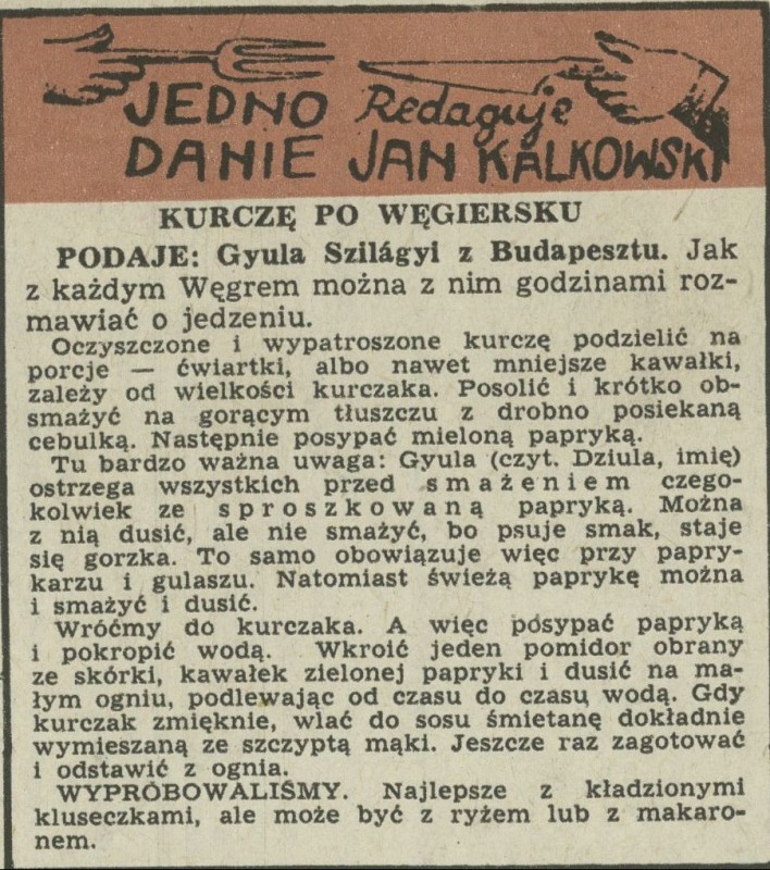 Archiwum / Jedno danie nr 961 (36/1963) 40394/123969 Podziel się Tytuł Kurczę po węgiersku Autor Jan Kalkowski Rubryka Jedno danie Artykuł z numeru 961 (36/1963) Data wydania 8 września 1963 Tagi gastronomia kulinaria przepis kulinarny kuchnia węgierska kurczak mięso
