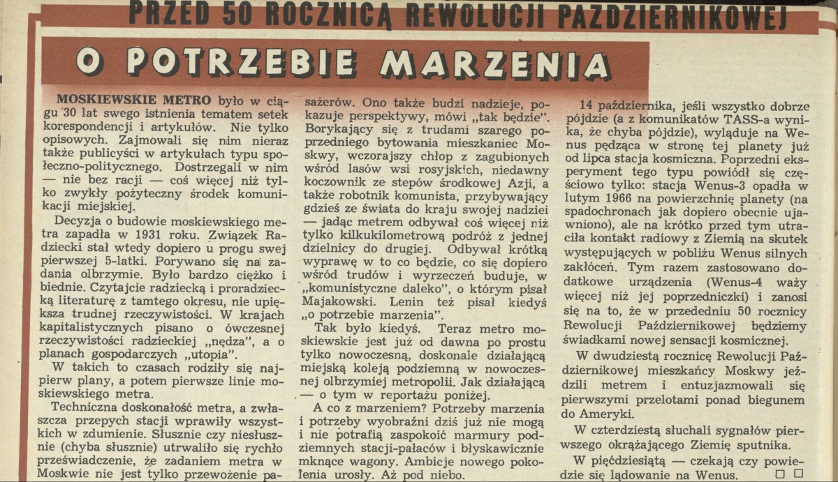 Archiwum / Artykuł nr 1174 (41/1967) 46/100 Podziel się Tytuł Przed 50 rocznicą rewolucji październikowej o potrzebie marzenia Kategoria Artykuł Artykuł z numeru 1174 (41/1967) Data wydania 8 października 1967 Tagi moskiewskie metro