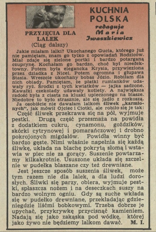 Archiwum / Kuchnia Polska nr 1131 (50/1966) 85/2107 Podziel się Tytuł Przyjęcia dla lalek Autor Maria Iwaszkiewicz Rubryka Kuchnia Polska Artykuł z numeru 1131 (50/1966) Data wydania 11 grudnia 1966 Tagi lalki