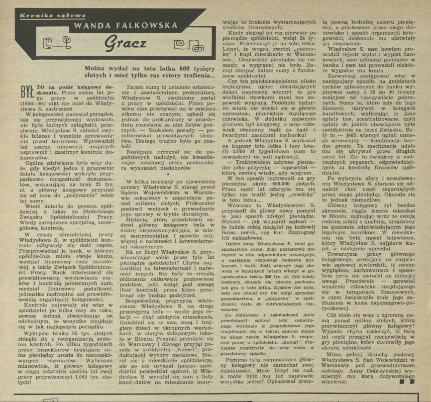 Archiwum / Kronika sądowa nr 1041 (12/1965) 43681/123969 Podziel się Tytuł Kronika sądowa: gracz Autor Wanda Falkowska Rubryka Kronika sądowa Artykuł z numeru 1041 (12/1965) Data wydania 21 marca 1965 Tagi oszustwo gra w toto-lotka
