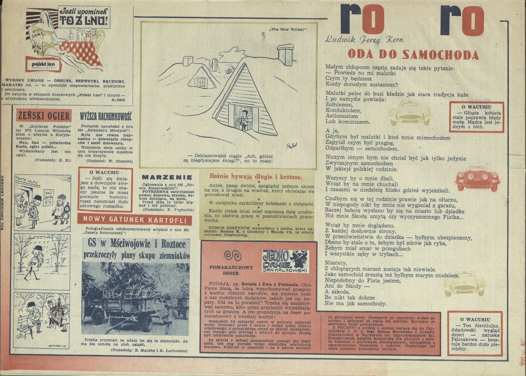 Archiwum / Rozmaitości [old] nr 1448 (01/1973) 59451/123969 Podziel się Tytuł Oda do samochoda Autor Ludwik Jerzy Kern Rubryka Rozmaitości [old] Artykuł z numeru 1448 (1/1973) Data wydania 7 stycznia 1973