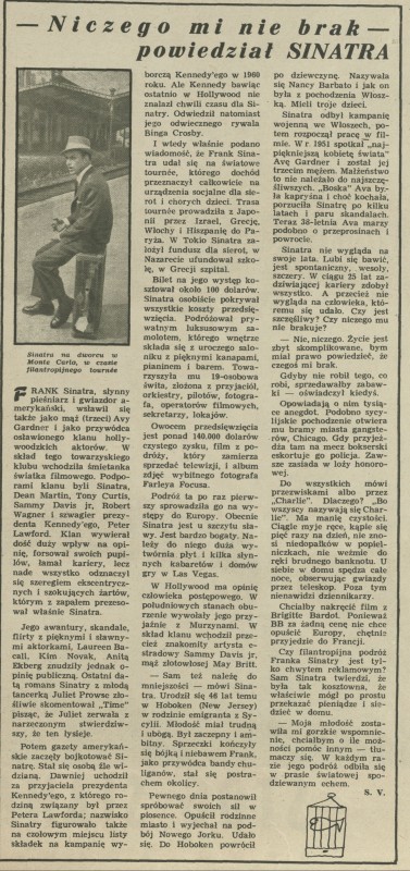 Archiwum / Kultura nr 899 (26/1962) 51/99 Podziel się Tytuł -Niczego mi nie brak - powiedział Sinatra Autor S. V. Kategoria Kultura Artykuł z numeru 899 (26/1962) Data wydania 1 lipca 1962