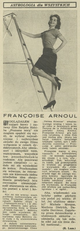 Archiwum / Astrologia dla wszystkich nr 712 (48/1958) 48/91 Podziel się Tytuł Francoise Arnoul Rubryka Astrologia dla wszystkich Artykuł z numeru 712 (48/1958) Data wydania 30 listopada 1958 Tagi aktorka gwiazdy filmowe kino