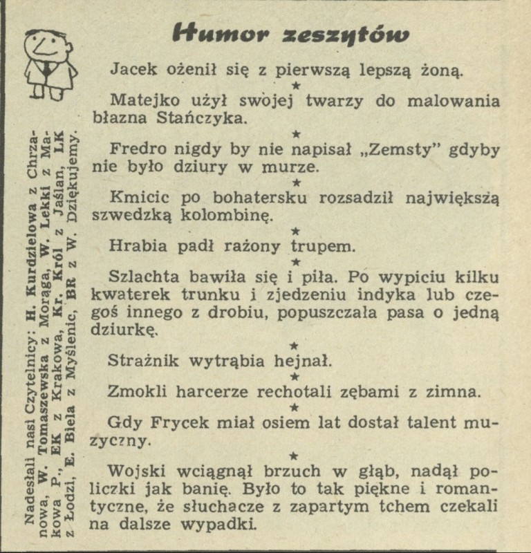 Archiwum / Humor zeszytów szkolnych nr 1043 (14/1965) 43774/123969 Podziel się Tytuł Humor zeszytów Rubryka Humor zeszytów szkolnych Artykuł z numeru 1043 (14/1965) Data wydania 4 kwietnia 1965 Tagi humor zeszytów szkolnych rozrywka