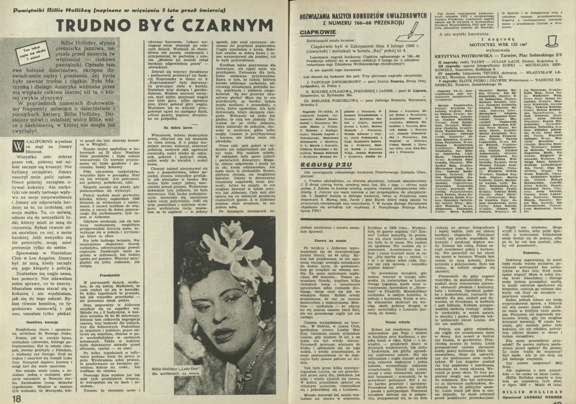 Archiwum / Dziennik nr 775 (07/1960) 31818/123969 Podziel się Tytuł Trudno być czarnym Autor Billie Holliday Kategoria Dziennik Artykuł z numeru 775 (7/1960) Data wydania 14 lutego 1960 Tagi pamiętnik rasizm narokotyki