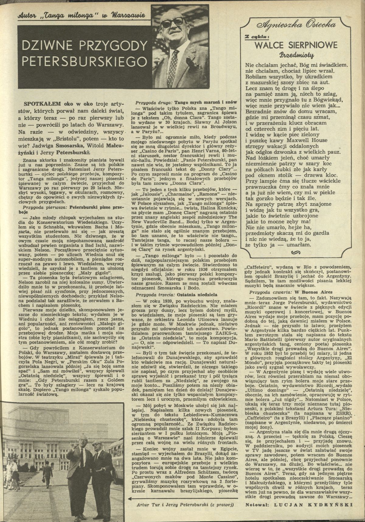 Archiwum / Wywiad nr 1173 (40/1967) 2/4 Podziel się Tytuł Dziwne przygody Peterburskiego Autor Lucjan Kydryński Kategoria Wywiad Artykuł z numeru 1173 (40/1967) Data wydania 1 października 1967 Tagi tango milonga