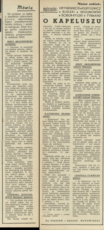 Archiwum / Ankieta nr 1046 (17/1965) 43879/123969 Podziel się Tytuł Mówią mężczyźni Autor Barbara Hoff Rubryka Ankieta Artykuł z numeru 1046 (17/1965) Data wydania 25 kwietnia 1965 Tagi ankieta damskie nakrycia głowy