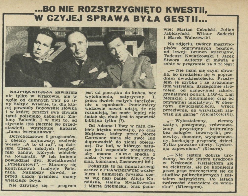 Archiwum / Różności nr 1046 (17/1965) 43881/123969 Podziel się Tytuł ...Bo nie rozstrzygnięto kwestii, w czyjej sprawa była gestii... Kategoria Różności Artykuł z numeru 1046 (17/1965) Data wydania 25 kwietnia 1965 Tagi Jama Michalikowa kabaret kawiarnia