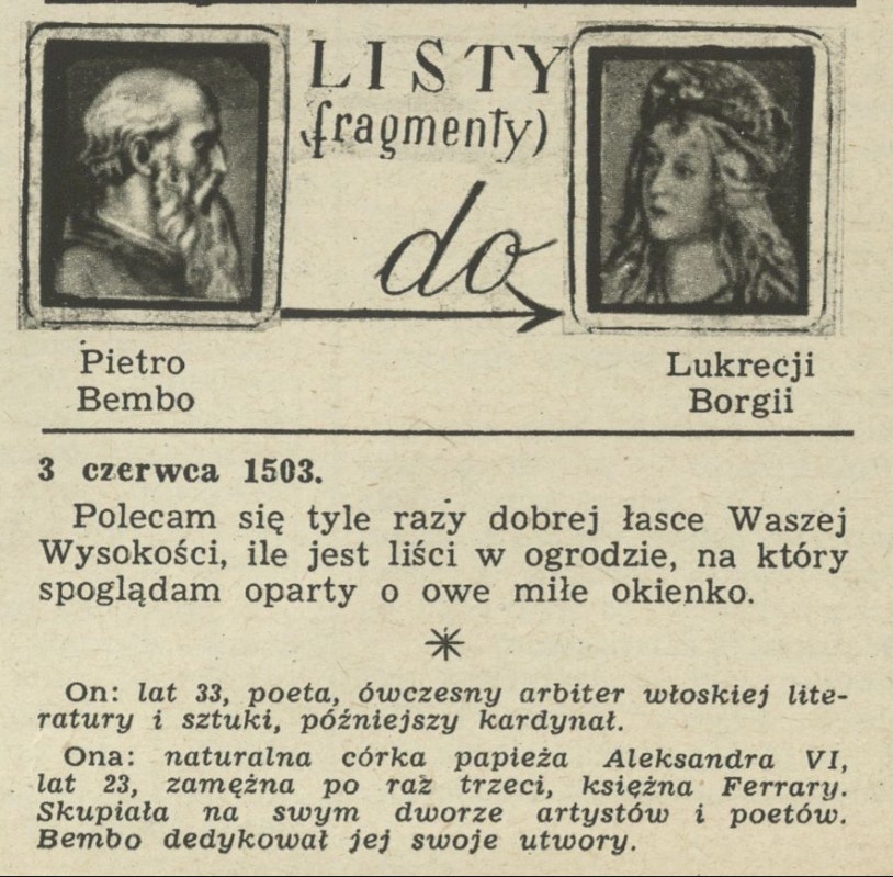 Archiwum / Różności nr 1050 (21/1965) 4/7 Podziel się Tytuł Listy Pietra Bembo do Lukrecji Borgii Kategoria Różności Artykuł z numeru 1050 (21/1965) Data wydania 23 maja 1965 Tagi Lukrecja Borgia Pietro Bembo listy
