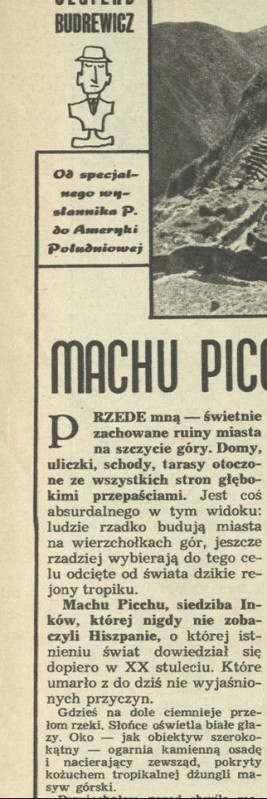 Archiwum / Felieton nr 1115 (34/1966) 1/1 Podziel się Tytuł Machu Picchu - umarłe miasto Inków Autor Olgierd Budrewicz Kategoria Felieton Artykuł z numeru 1115 (34/1966) Data wydania 21 sierpnia 1966 Tagi Machu Picchu Inkowie Budrewicz