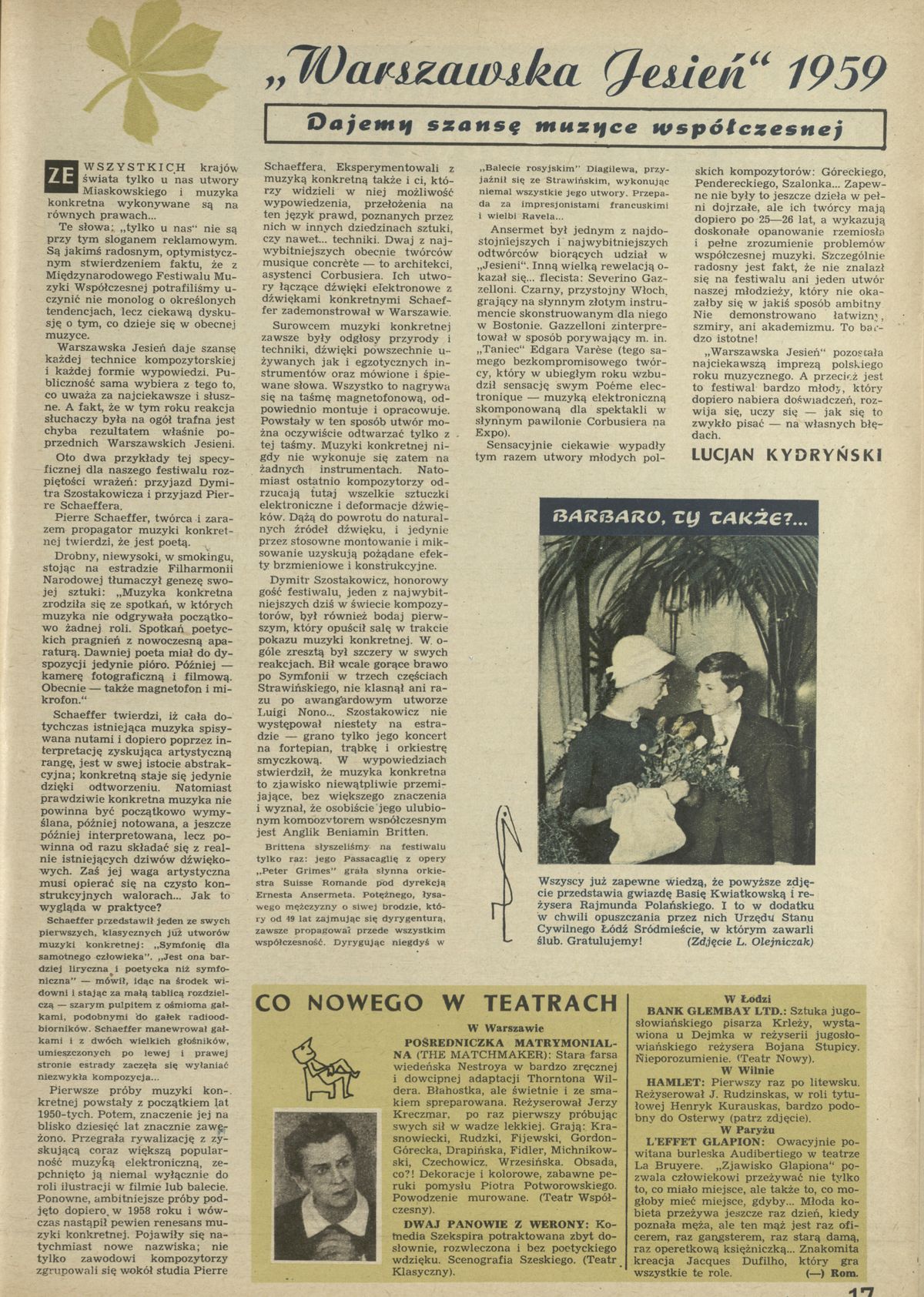 Archiwum / Artykuł nr 756 (40/1959) 30994/123969 Podziel się Tytuł Warszawska Jesień 1959 Autor Lucjan Kydryński Kategoria Artykuł Artykuł z numeru 756 (40/1959) Data wydania 4 października 1959 Tagi muzyka